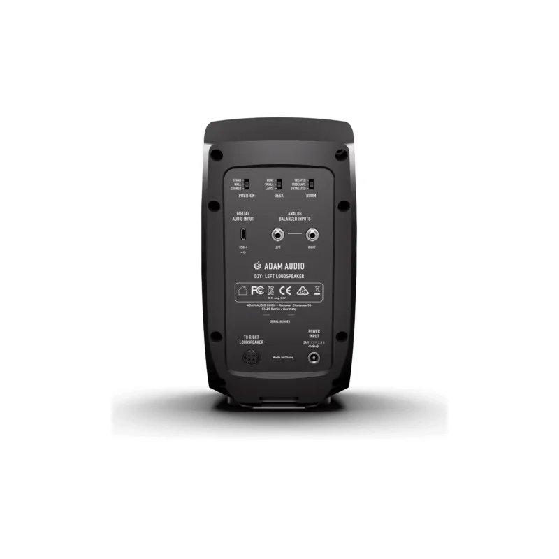 Adam Audio D3V Black Sistema de monitor de secretária ativo ;Equipado com: woofers de alumínio de 3,5' + tweeter de fita D-ART de 1,5' ;Saída do amplificador: woofer de 2x 80 watts de pico (2x 70 watts RMS), tweeter de 2x 40 watts de pico (2x 30 watts RMS) ;Radiadores passivos de dupla face para amplificar as frequências mais baixas e aumentar o nível de pressão sonora ;máx. SPL: 96 dB ,Gama de frequências: 48 Hz - 22.600 Hz (@ -3 dB), 45 Hz - 23.200 Hz (@ -6 dB) ;USB-C Plug & Play para ligação direta a um computador, smartphone ou tablet com ligação USB-C ;Conversor AD integrado: 24 bits / 32, 44,1, 48 kHz ;Ajuste da sala baseado em DSP ;Controlo de volume ;Rosca de 3/8' para montagem em suportes de microfone ;2 entradas de linha: Ficha de 6,3 mm ;Saída de auscultadores estéreo: Mini jack de 3,5 mm ;USB C ;Ligação da fonte de alimentação ;Dimensões sem suporte (A x L x P): 200 x 115 x 150 mm ;Peso: 1,85 kg altifalante esquerdo, 1,73 kg altifalante direito ;Cor: Preto ;Inclui suporte de secretária / monitor, cabo de ligação de 2 metros, cabo USB-C para USB-C e cabo USB-C para USB-A ;