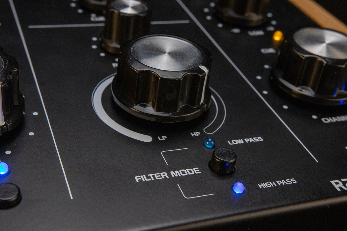 Misturador DJ rotativo de 2 canais com filtros passa-alto e passa-baixo ;