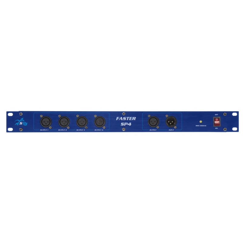 Descrição O Faster Splitter é um distribuidor de sinal DMX, dispositivo útil tanto para usuários experientes quanto para iniciantes. Graças às suas 4 linhas, este splitter melhora a transmissão do sinal DMX, além de tornar a cadeia de desenvolvimento mais fácil e segura. SG FASTERSP4Especificações técnicas ? 1 entrada ? 4 saídas DMX512? Entrada e Saídas opto-isoladas entre si? Saída para ligação a outro distribuidor? Ligação IN/OUT XLR 3 polos? Rack standard 1U 19'' Fonte de energia ? CA~100-240 V ? 50/60 Hz Peso e dimensões ? Peso líquido: 3,0 kg? Dimensões: 482x45x130 mm